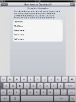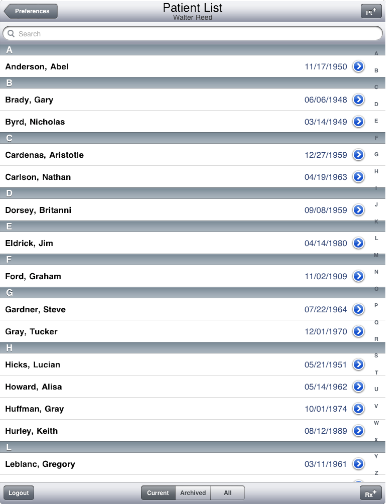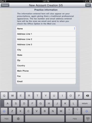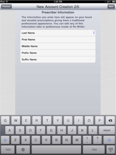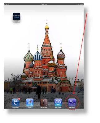 To get started using Rx-Writer, launch the application by tapping the Rx-Writer icon wherever you may have installed it. Finding the Rx-Writer application icon may be somewhat challenging because the iPad operating system seems to install new applications somewhat randomly. You may have to look through all of your application pages for the blue Rx icon.