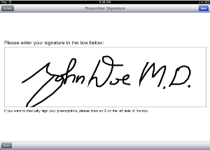 We have created a way to capture your signature within Rx-Writer placing your signature on every faxed and emailed prescription. Use your finger to write your name inside the box. You may want to select clear until you are happy with your signature. I find it easier to turn my iPad horizontally when entering my signature.