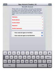 At the bottom of screen is the End User License Agreement ("EULA") and Disclaimer to which you will have to agree. Press the blue detail disclosure button review EULA and Disclaimer before continuing. The EULA and Disclaimer are unfortunately standard. You may review EULA and Disclaimer in depth at any time by visiting our web site. After agreeing to the EULA and Disclaimer, you will be taken to New Account Creation. When you have entered your user name and password select new user and Rx-Writer will take you to the next step: Prescriber Information.