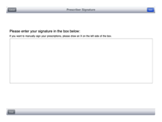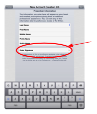 To create your signature for your Rx-Writer prescriptions, tap the Enter Signature field below. You can use your finger or a stylus. Later, you will be able edit your signature as needed within the preferences section of Rx-Writer. After you have entered your signature, tap the next button in the upper right hand corner to proceed to step three.